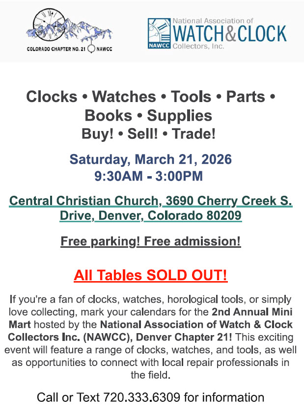 The 2026 Denver Mini Mart was a complete success. There were 27 tables sold which was a complete sellout. The public was welcome buyers bought, sellers sold. A good day was had by all.